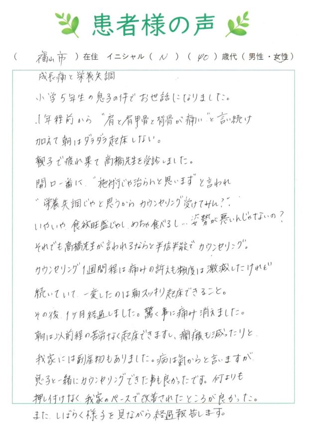 成長痛でお困りの小学生のお母様から以下のような喜びのコメントを頂きました