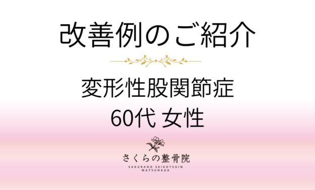 股関節調整、背骨調整(さくらの式全身調整法)、殿筋調整、温熱機械を実施したところ、初回施術後からFullで屈伸出来る様になり、痛みもなくなり、「こんなに変化が出たことはない」とご本人様も喜ばれていました。現在は通院中ですが、寝起きの痛みがかなり改善し、他の動作も段々と痛みが減り、可動域が広がっている状況です。